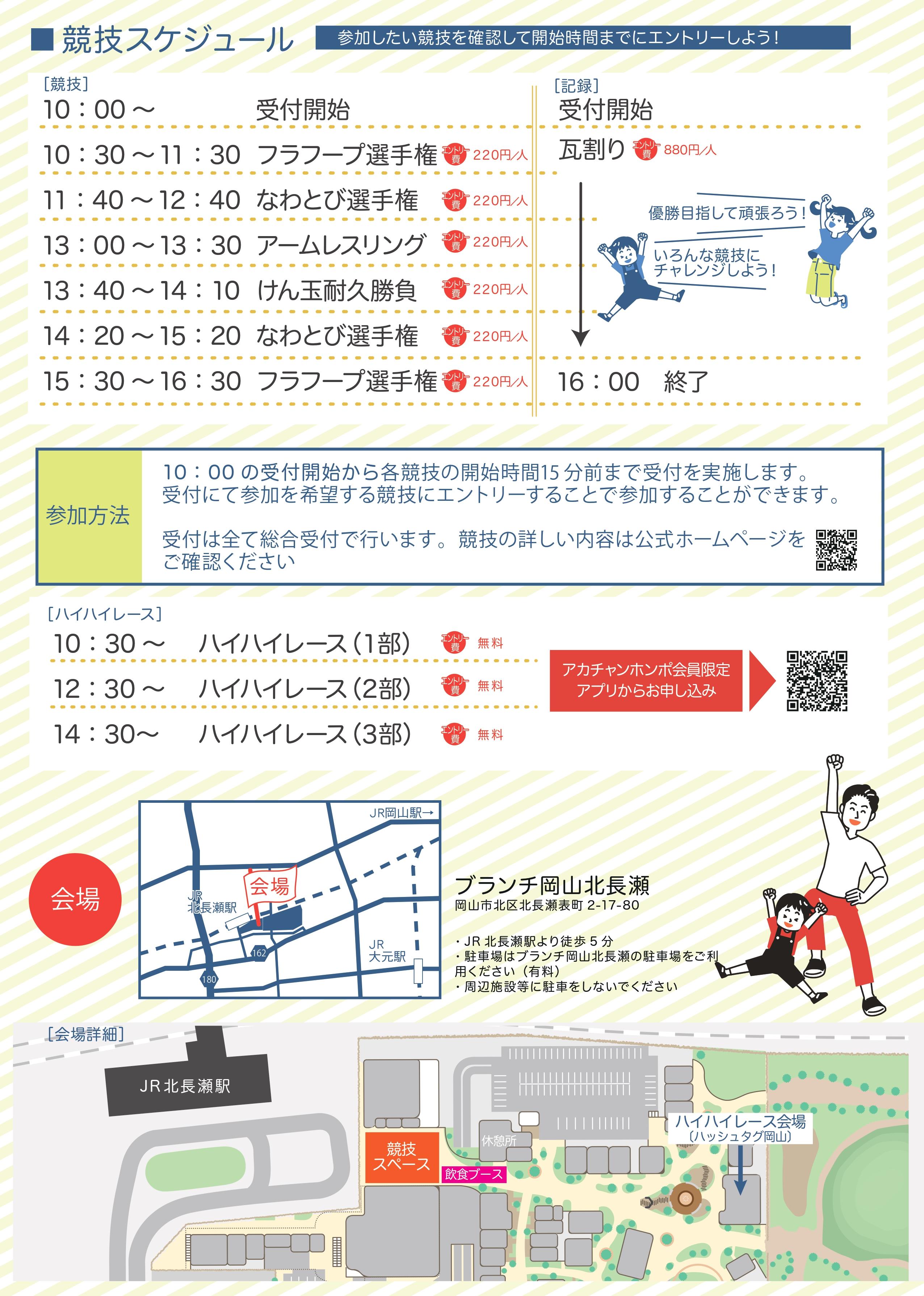 力自慢集まれ!各部門の開始時刻までにエントリーをお済ませください。 |